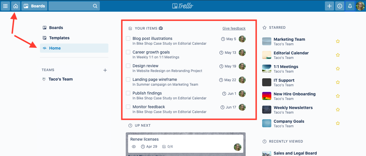 To navigate to ‘Your Items’ within Trello, click the Home icon in the top left corner, then go to the Home tab in the left-hand navigation. There you will be able to view all of the checklist items assigned to you across all your boards, in order by due date.